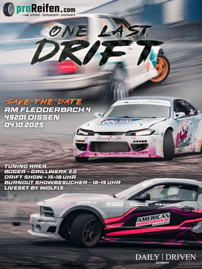 Erlebe das ultimative Fahrerlebnis! Bei „One Last Drift“ treffen sich die besten Drift-Profis, leidenschaftliche Tuning-Fans und jeder, der die Geschwindigkeit liebt. Spüre den Adrenalinkick auf der Driftstrecke, genieße die besten Burger im Umkreis und erlebe spannende Burnout-Areas, DB-Messungen und zahlreiche Aussteller. Sei dabei, wenn die Motoren aufheulen und die Reifen durchdrehen!